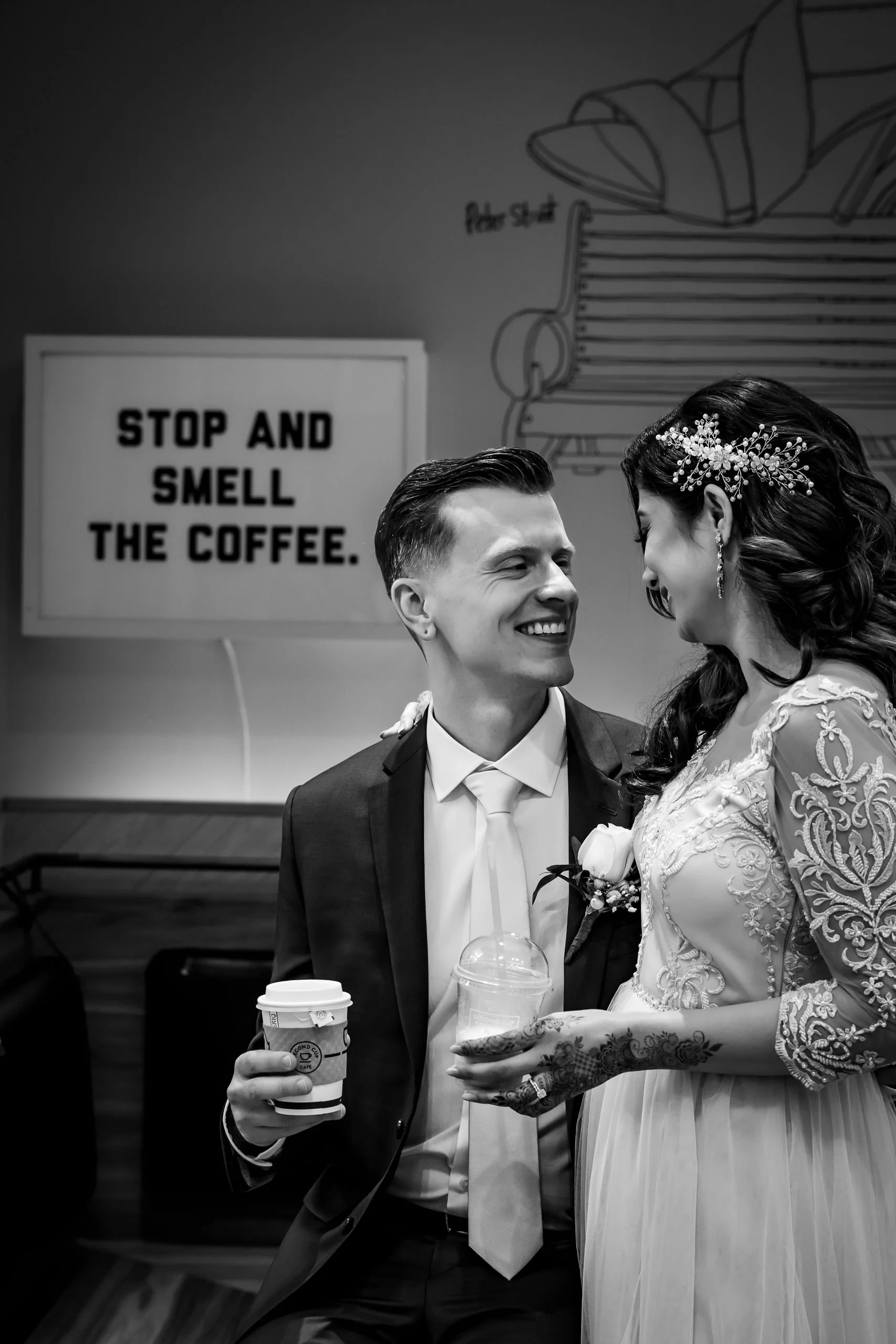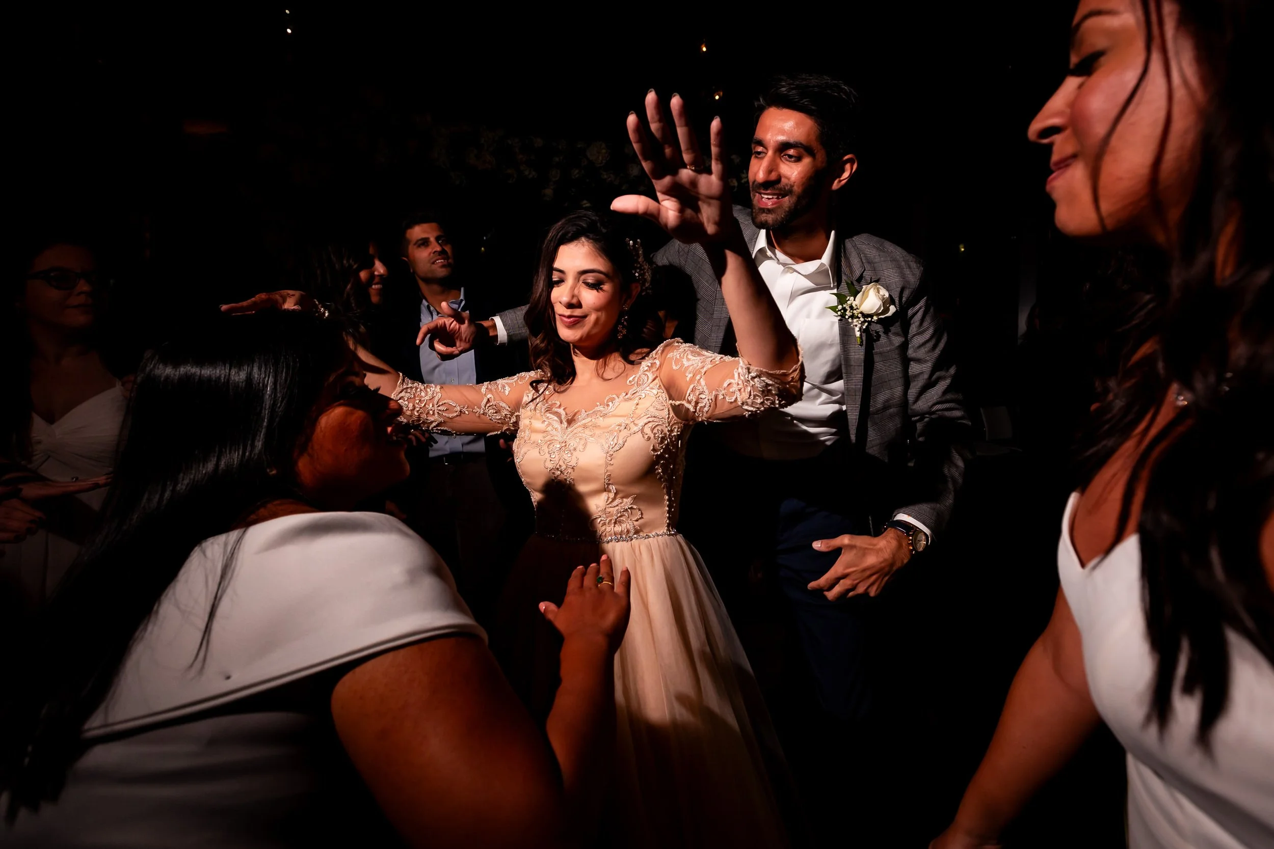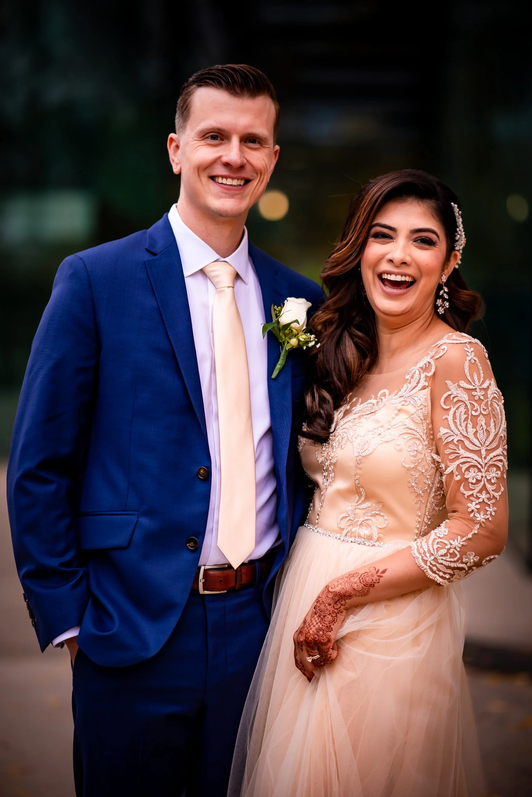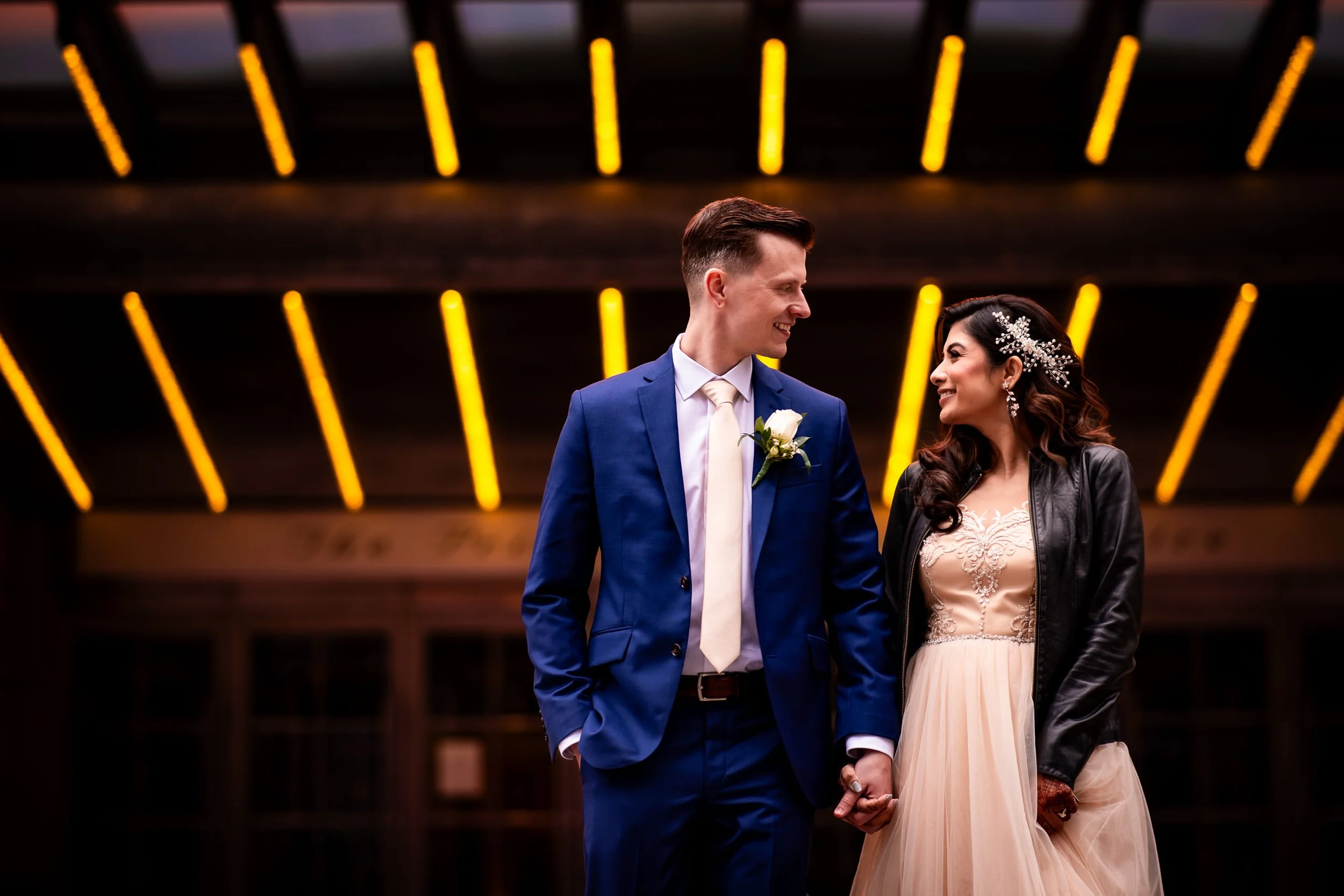 Aliza and Mike’s downtown Toronto wedding was the perfect blend of city energy, cultural style, and laid-back celebration. With no ceremony or traditional prep coverage, the focus was all on the portraits and the party — and both delivered in a big way. We started their couple portraits right in the heart of the city, using the streets of King West as a backdrop. Aliza looked stunning in a champagne-toned South Asian-inspired gown, while Mike brought the bold with a bright blue suit — both standing out beautifully against the Toronto skyline.