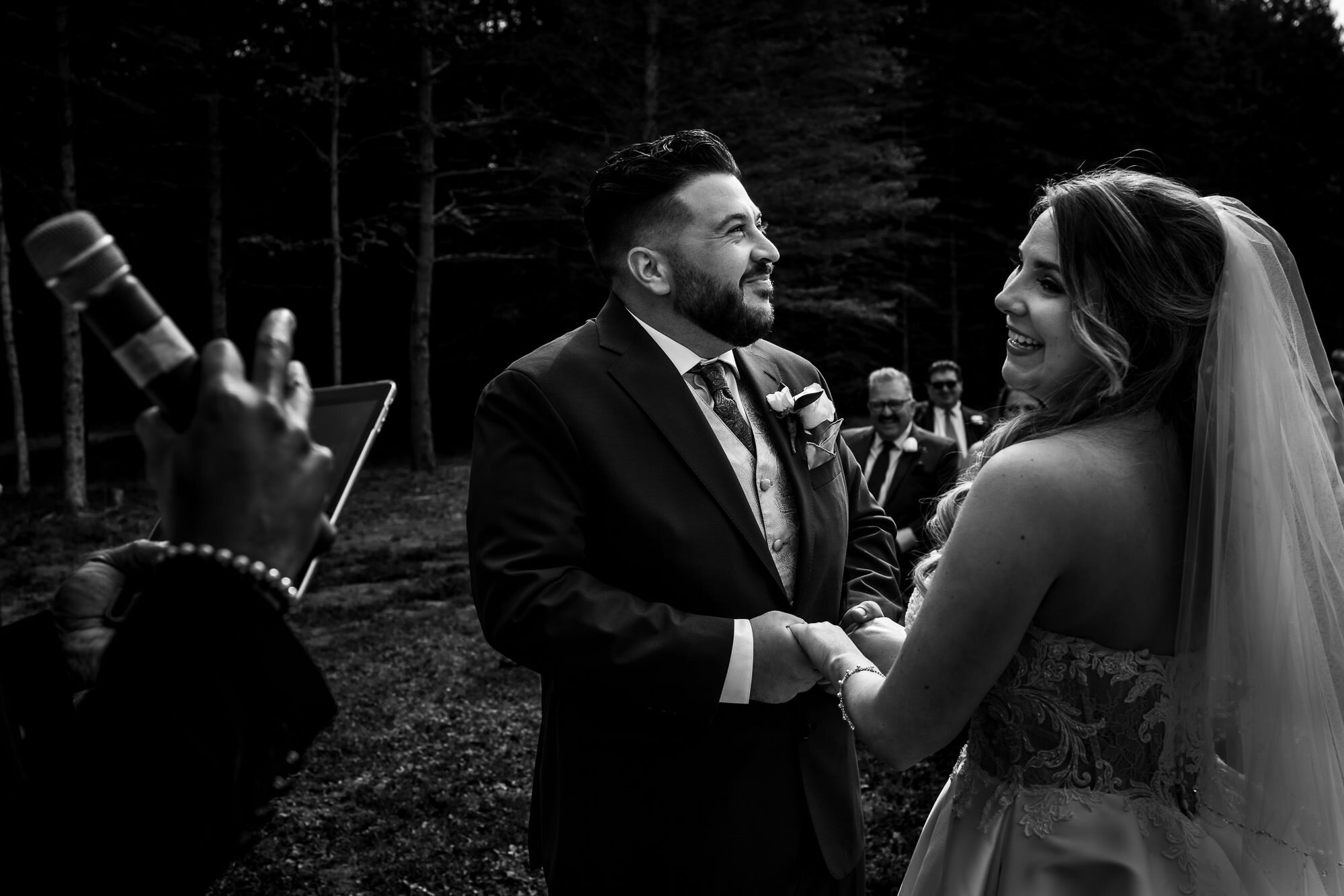 Stefano’s family home is situated on a picturesque property, so finding the perfect spot for their backyard ceremony was easy. The outdoor ceremony was held right in front of a pond, with a rustic wooden wedding arch from Mid Valley Gardens, tall rushes, bright yellow flowers, and tall trees and woods serving as the ceremony backdrop - it couldn’t be anymore perfect and romantic. Stefano was beaming as he walked down the aisle accompanied by his mom, but as he took his place at the front you could see all the emotions flooding in. Since the walk from the home to the ceremony space is rather long, Brittany wanted Stefano’s first look at her to be when she was just about to walk down the aisle. As Brittany approached, Stefano turned around with a big deep inhale to steady his nerves, and there was Brittany, herself doing her best to not cry as her dad walked her down the aisle. If any of the guests managed to hold back their tears by this point, I highly doubt there was a dry eye by the end of the ceremony as Kim’s outpour of emotion when Brittany and Stefano said their I do’s and offered Kim her very own ring was the sweetest and most touching part of the day.