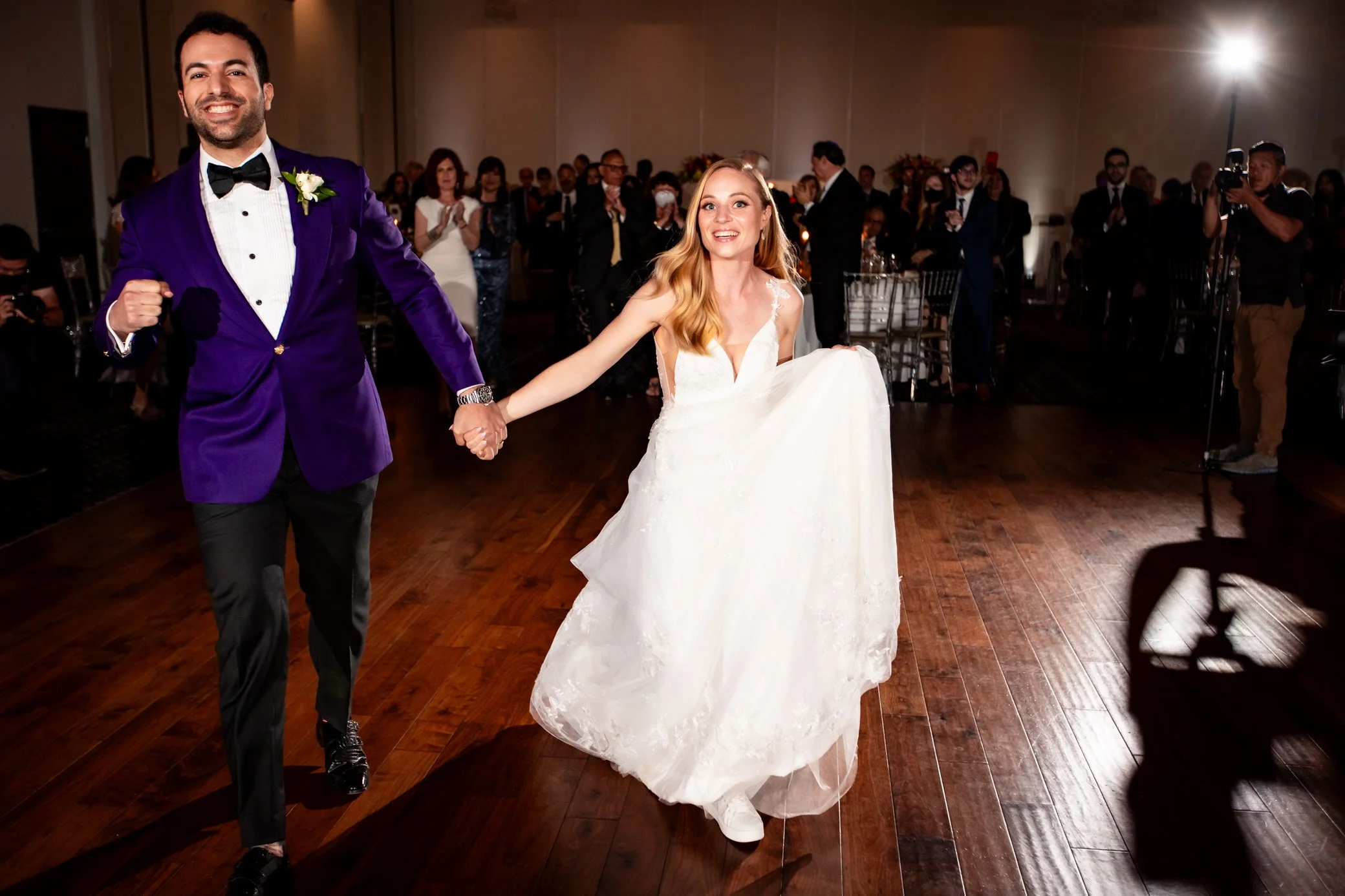 As the reception kicked off at the same gorgeous venue, Jordana and Jeremy made their grand entrance to thunderous applause and joy that practically bounced off the walls. Jeremy’s sharp purple suit and Jordana’s elegant yet playful gown set the tone.