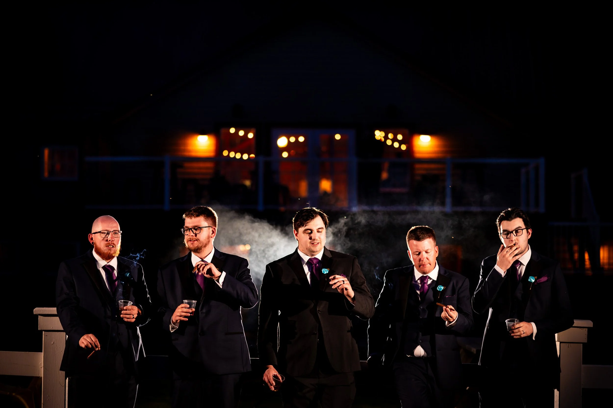 As the night wound down, we pulled the groomsmen outside for a quick cigar photo session. This is something I love to do at the end of a wedding. It only takes a few minutes, but it always delivers. There is something about that late-night energy. A group of friends standing together, the night sky above them, the venue glowing in the background. It always ends up looking like an album cover. And Matt’s crew nailed it.